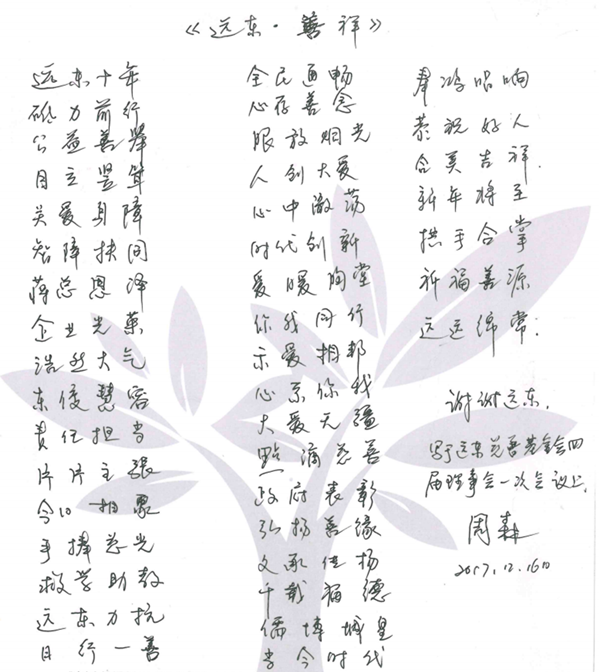 远东慈善基金会过去十年坚守,始终如一开展多项慈善活动,将身障人事业定位为基金会工作的核心;2018年,远东慈善基金会将在理事会的指导下,继续身障人的创业帮扶工作,与党和国家同频共振,全心全意,锲而不舍,让身障朋友们能更加自尊自信、自强自立、共同奋力,谱写未来美好生活的新篇章!