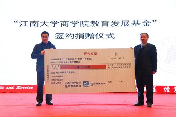 12月18日,在江南大学商学院四届三次董事会议上,远东控股集团与江南大学教育发展基金会举行捐赠签约仪式,远东控股集团向江南大学商学院“尚学教育基金”捐赠1000万元。远东控股集团2007年在商学院设立远东奖(助)学金,此前已为该基金会进行多次捐赠。