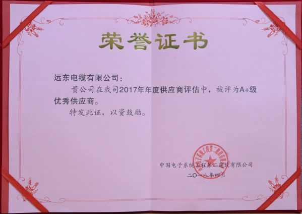 4月13日,远东智慧能源股份有限公司(简称:智慧能源  股票代码:600869)全资子公司远东电缆有限公司(简称:远东电缆)应邀参加中国电子系统工程第二建设有限公司2017年度供应商大会。远东电缆从上百家供应商中脱颖而出,荣获“最佳质量奖”和“A+级优秀供应商”荣誉称号,成为电线电缆行业唯一获此殊荣的企业。